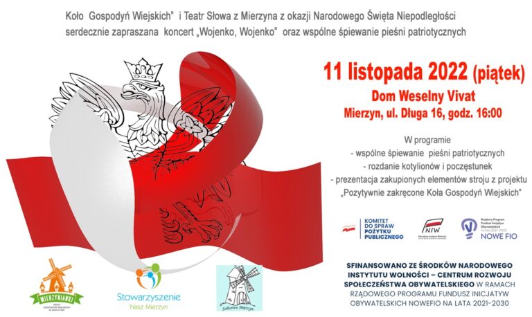 11 listopada 2022 r. Zespół folklorystyczny „Mierzynianki” wraz z Teatrem Słowa w Mierzynie wziął udział w koncercie pieśni patriotycznych pn. „Wojenko, wojenko”.